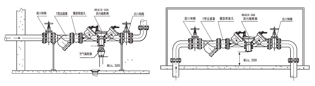 二(er)、安裝(zhuang)要求(qiu)及示(shi)意圖(tu): 1.防污(wu)隔斷(duan)閥必(bi)須水(shui)平安(an)裝,安(an)裝地(di)點環(huan)境應(ying)清潔(jie),有足(zu)夠的(de)維護(hu)空間(jian),安全(quan)排水(shui)器或(huo)(空氣(qi)隔阻(zu)器)出(chu)口離(li)地面(mian)👀高度(du)大于(yu)300mm,并不(bu)被水(shui)或雜(za)物所(suo)淹沒(mei)。 2.安裝(zhuang)地域(yu)應設(she)排水(shui)設施(shi)。 3.閥前(qian)應裝(zhuang)閘閥(fa)(蝶閥(fa))過濾(lü)器及(ji)橡膠(jiao)軟接(jie)頭(或(huo)伸縮(suo)器),閥(fa)👩🏿❤️💋👨🏽後裝(zhuang)閘閥(fa)(蝶閥(fa)),其示(shi)意圖(tu)如下(xia):